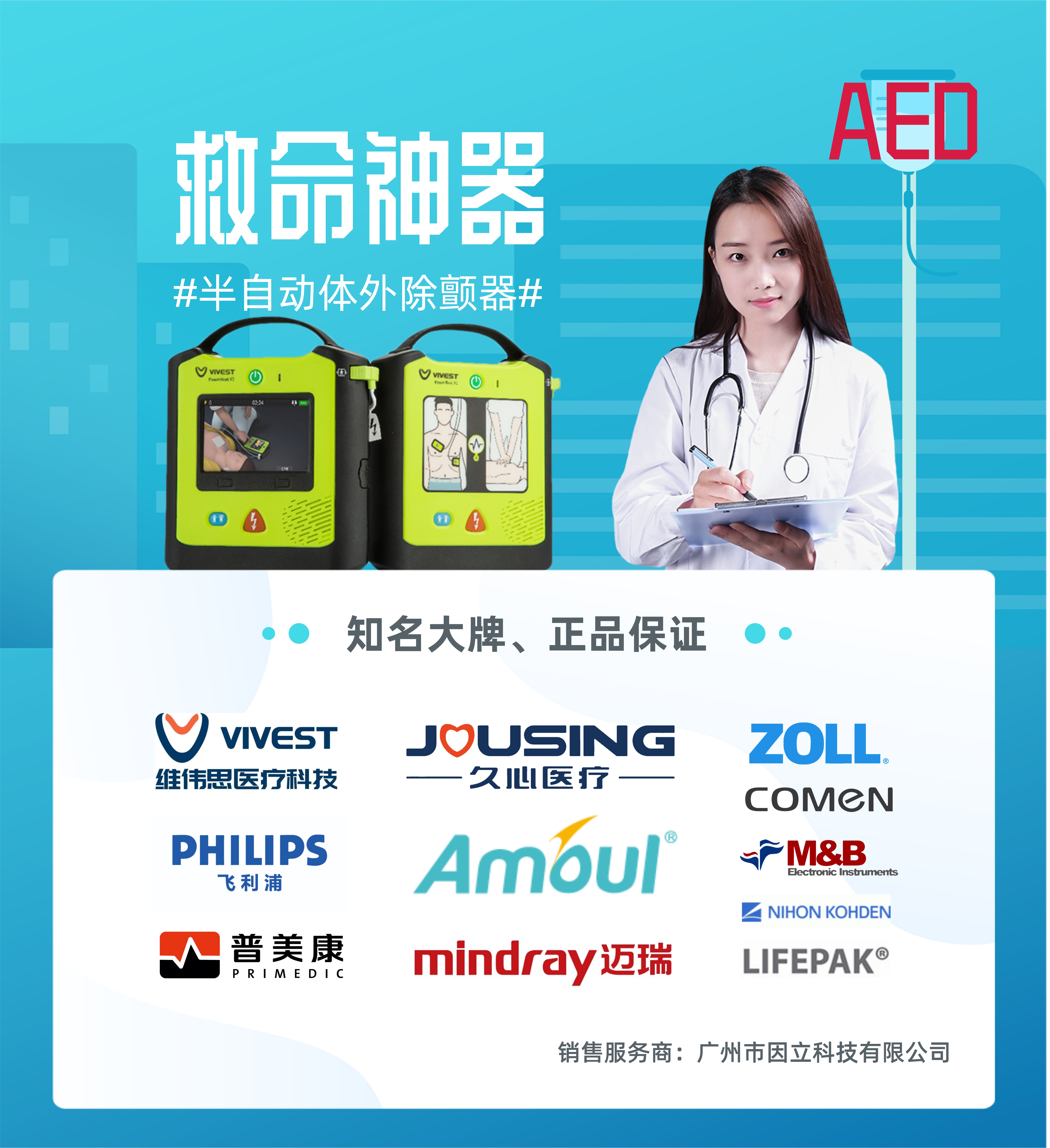 自动体外除颤器(AED)又称自动体外电击器、自动电击器、自动除颤器、心脏除颤器及傻瓜电击器等,是一种便携式的医疗设备,可以诊断特定的心律失常,并且给予电击除颤,是可被非专业人员使用的用于抢救心脏骤停患者的医疗设备。基本上所有发生心脏骤停需要心肺复苏的病人都需要使用AED。在心跳骤停时,只有在最佳抢救时间的“黄金4分钟”内,利用自动体外除颤器(AED)对患者进行除颤和心肺复苏,才是最有效制止猝死的办法。